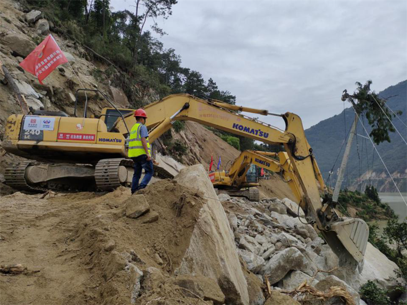 搶險隊(duì)伍,馬上出發(fā)!集團(tuán)領(lǐng)導(dǎo)班子立即召開碰頭會,分析研判形勢,安排部署工作,密切關(guān)注震區(qū)態(tài)勢,成立抗震救災(zāi)領(lǐng)導(dǎo)小組,副總經(jīng)理鐘焱宇率現(xiàn)場指揮組趕赴石棉靠前指揮搶險救災(zāi)。正在石棉G108線施工的康藏路橋公司項(xiàng)目部組成10人搶險救援小分隊(duì),攜帶挖掘機(jī)4臺、拖車4臺、裝載機(jī)3臺、交通運(yùn)輸車2輛、無人機(jī)1臺,第一時間到就地?fù)岆U工作,震后7小時,完成國道G108線馬富至菩薩崗約40公里路段、6處塌方點(diǎn)1600余方土石方清理,爾后轉(zhuǎn)戰(zhàn)石棉縣新民鄉(xiāng)進(jìn)行通鄉(xiāng)道路搶通作業(yè)。