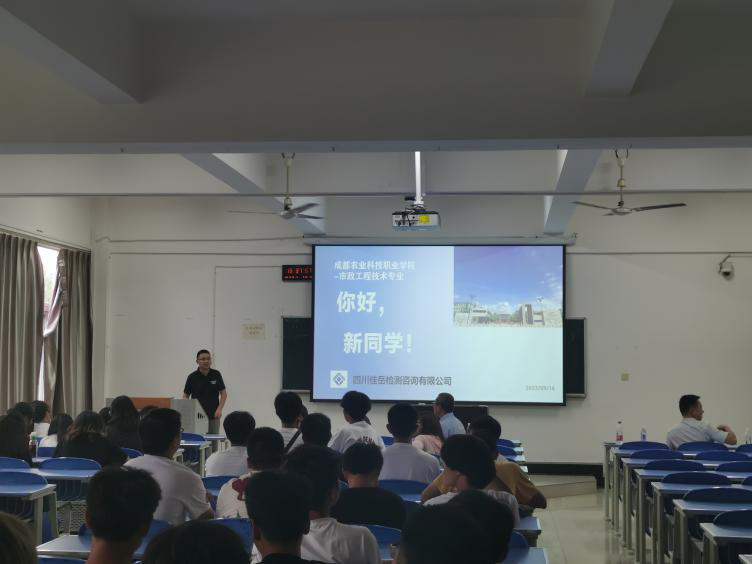 為深化校企合作,促進(jìn)合作內(nèi)容全面落實(shí)落地、交流融合,近日,交建集團(tuán)四川佳岳檢測(cè)公司應(yīng)邀參加成都農(nóng)業(yè)科技職業(yè)學(xué)院城鄉(xiāng)建設(shè)學(xué)院市政班入學(xué)專業(yè)教育分享會(huì)。佳岳公司檢測(cè)技術(shù)部工程師侯濤在會(huì)上作分享交流。