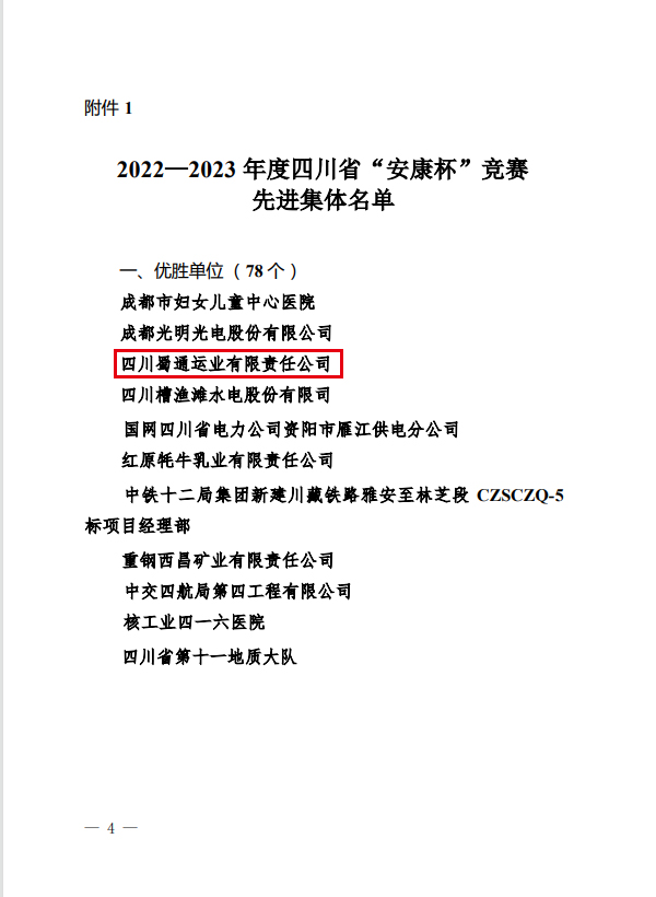日前,省總工會、省應(yīng)急管理廳、省衛(wèi)健委聯(lián)合發(fā)文表揚(yáng)2022-2023年度四川省“安康杯”競賽先進(jìn)集體和先進(jìn)個人,蜀通公司被評為“優(yōu)勝單位”。