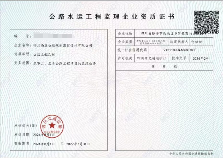 近日,經(jīng)四川省交通運(yùn)輸廳批準(zhǔn),雅安交建集團(tuán)勘察設(shè)計公司成功取得公路工程監(jiān)理乙級資質(zhì),該資質(zhì)的成功獲批,標(biāo)志著我公司業(yè)務(wù)邁向新領(lǐng)域。