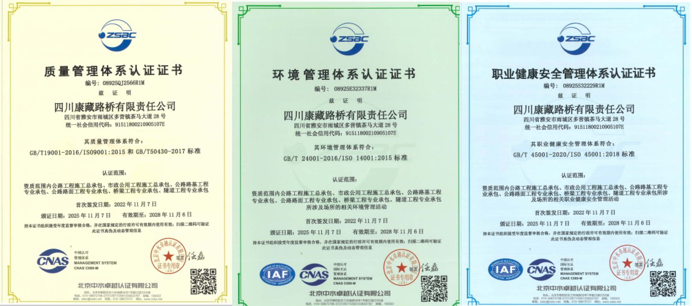 近日,康藏路橋公司順利通過質(zhì)量管理體系、環(huán)境管理體系及職業(yè)健康安全管理體系評審,并成功獲得相應(yīng)認證證書。