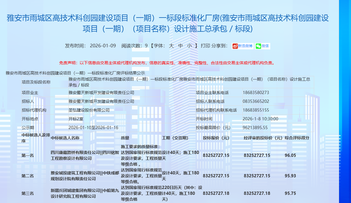 蓄勢突破,奮楫開新?挡芈窐蚬境晒孬@雅安市雨城區(qū)高技術(shù)科創(chuàng)園建設(shè)項目(一期)一標段標準化廠房項目,中標金額8325.27萬元,為公司2026年發(fā)展強勢開篇,迎來馬年“開門紅”。