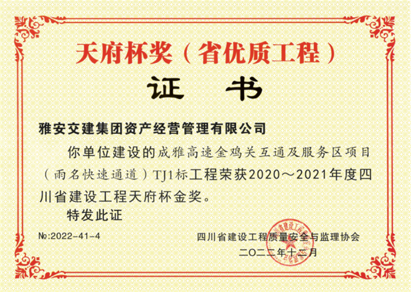 近日,雅安交建集團資產(chǎn)經(jīng)營管理有限公司建設的成雅高速金雞關互通及服務區(qū)項目(雨名快速通道)TJ1標工程榮獲2020-2021年度四川省建設工程天府杯金獎。