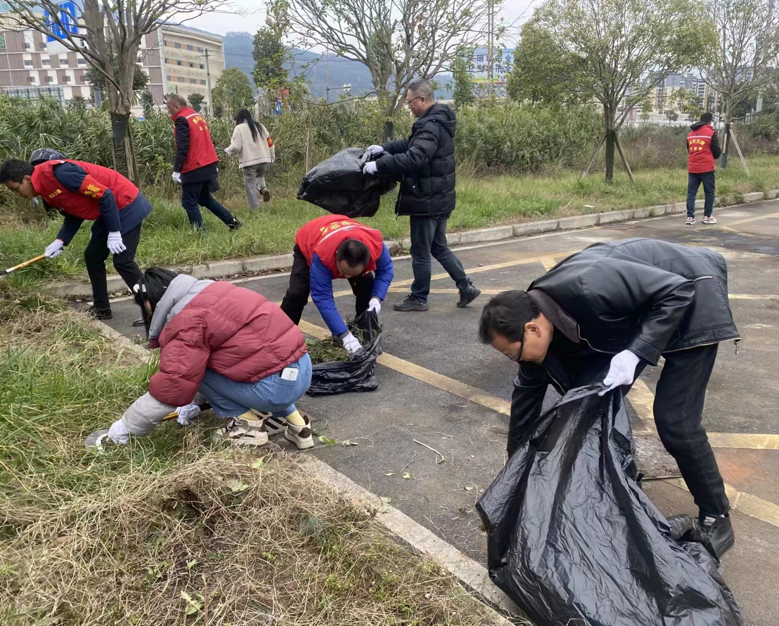 活動中,20余名黨員、入黨積極分子、團員身著紅馬甲,肩戴紅袖章,手持鐮刀、垃圾袋等清潔工具,以小組的形式,明確分工,對大興街道興貿路A段綠化帶雜草進行清理,并撿拾各種紙屑、廢棄塑料袋等垃圾。