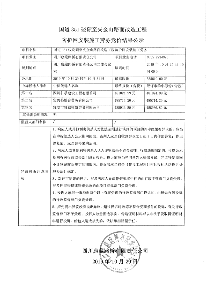 四川康藏路橋有限責(zé)任公司國(guó)道351磽磧至夾金山路面改造工程防護(hù)網(wǎng)安裝施工勞務(wù)競(jìng)價(jià)結(jié)果公示