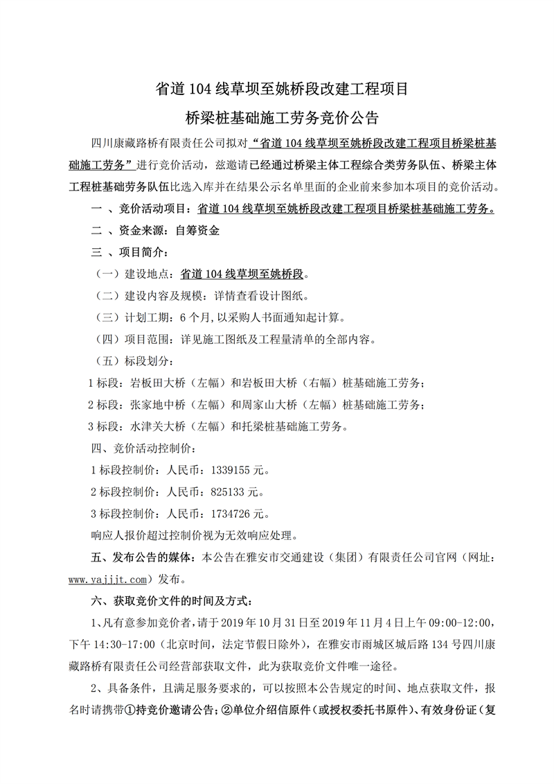 四川康藏路橋有限責(zé)任公司省道104線草壩至姚橋段改建工程項(xiàng)目橋梁樁基礎(chǔ)施工勞務(wù)競價(jià)公告