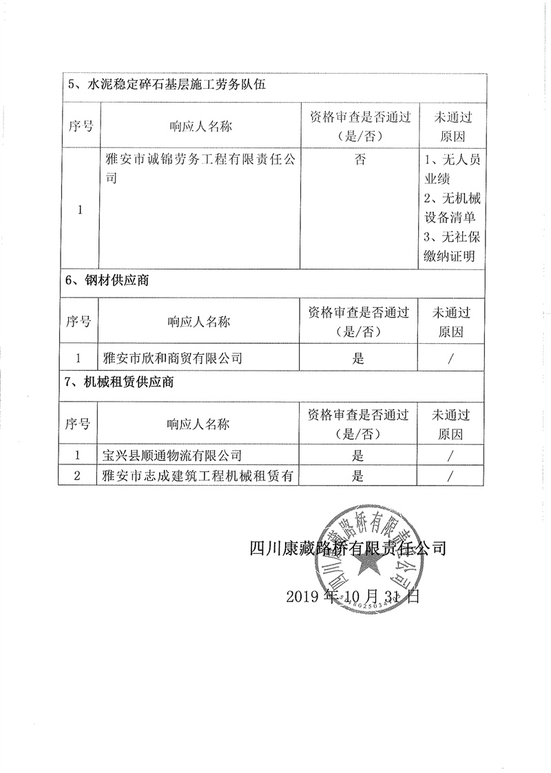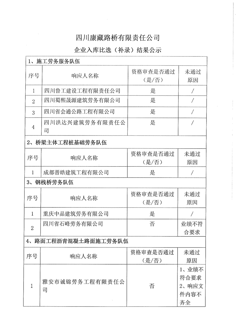 四川康藏路橋有限責(zé)任公司企業(yè)入庫(kù)比選(補(bǔ)錄)結(jié)果公示