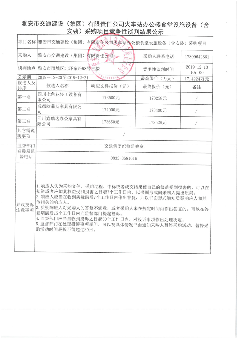 雅安市交通建設(shè)(集團(tuán))有限責(zé)任公司火車站辦公樓食堂設(shè)施設(shè)備(含安裝)采購項(xiàng)目競(jìng)爭(zhēng)性談判結(jié)果公示