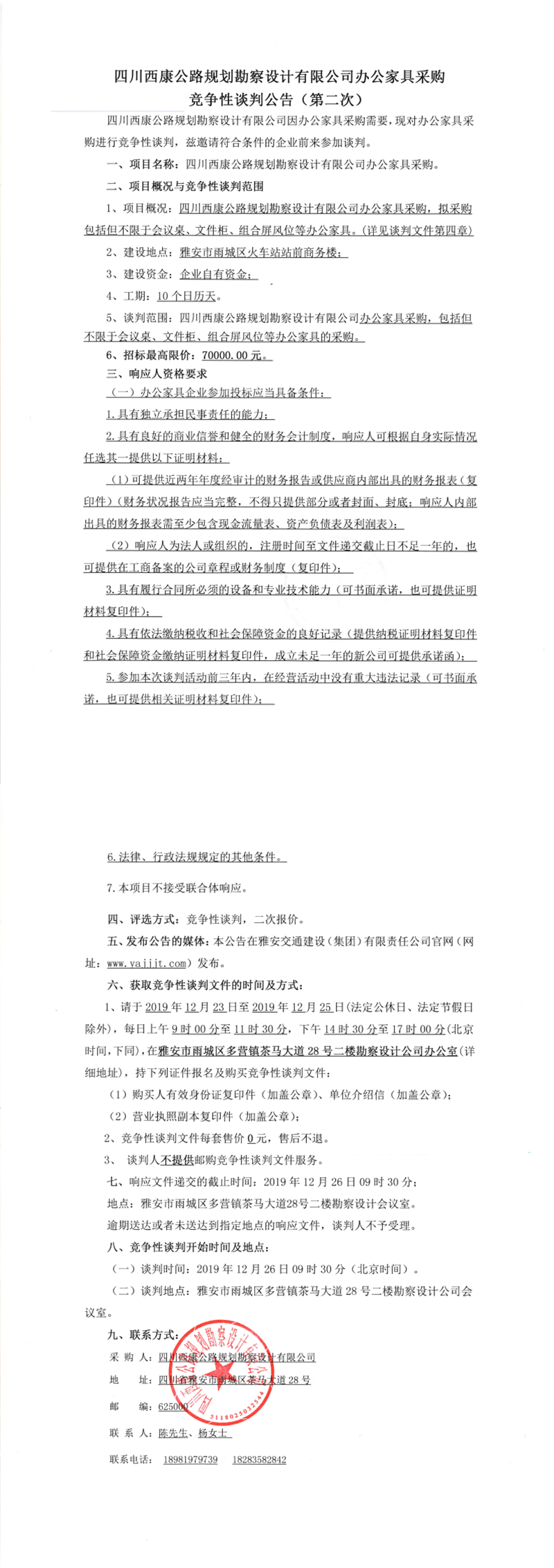 四川西康公路規(guī)劃勘察設(shè)計(jì)有限公司辦公家具采購(gòu)競(jìng)爭(zhēng)性談判公告(第二次)