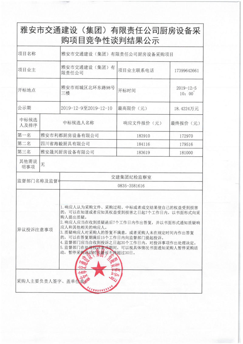 雅安市交通建設(shè)(集團)有限責(zé)任公司廚房設(shè)備采購項目競爭性談判結(jié)果公示