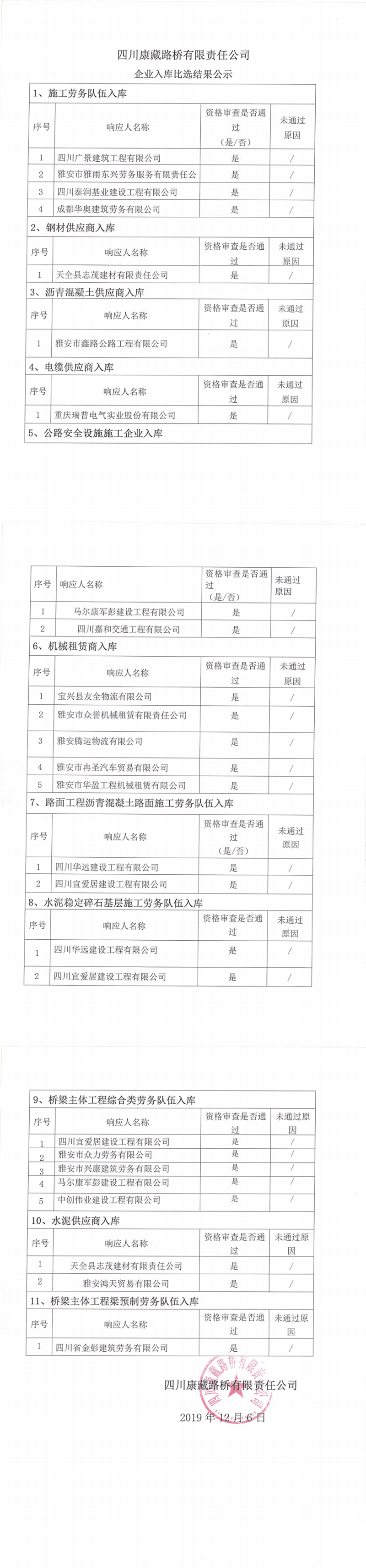 四川康藏路橋有限責(zé)任公司企業(yè)入庫(kù)比選結(jié)果公示
