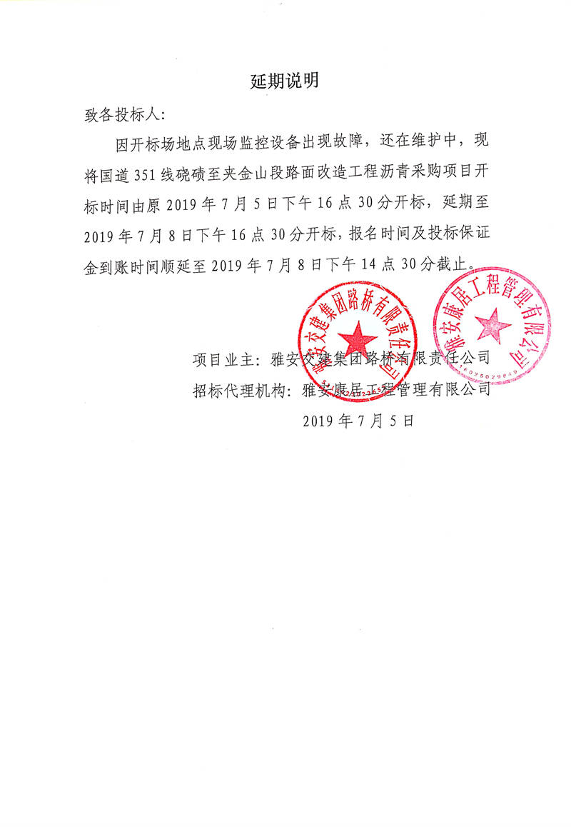 雅安交建集團(tuán)路橋有限責(zé)任公司國(guó)道351線磽磧至夾金山段路面改造工程瀝青采購(gòu)招標(biāo)延期說明