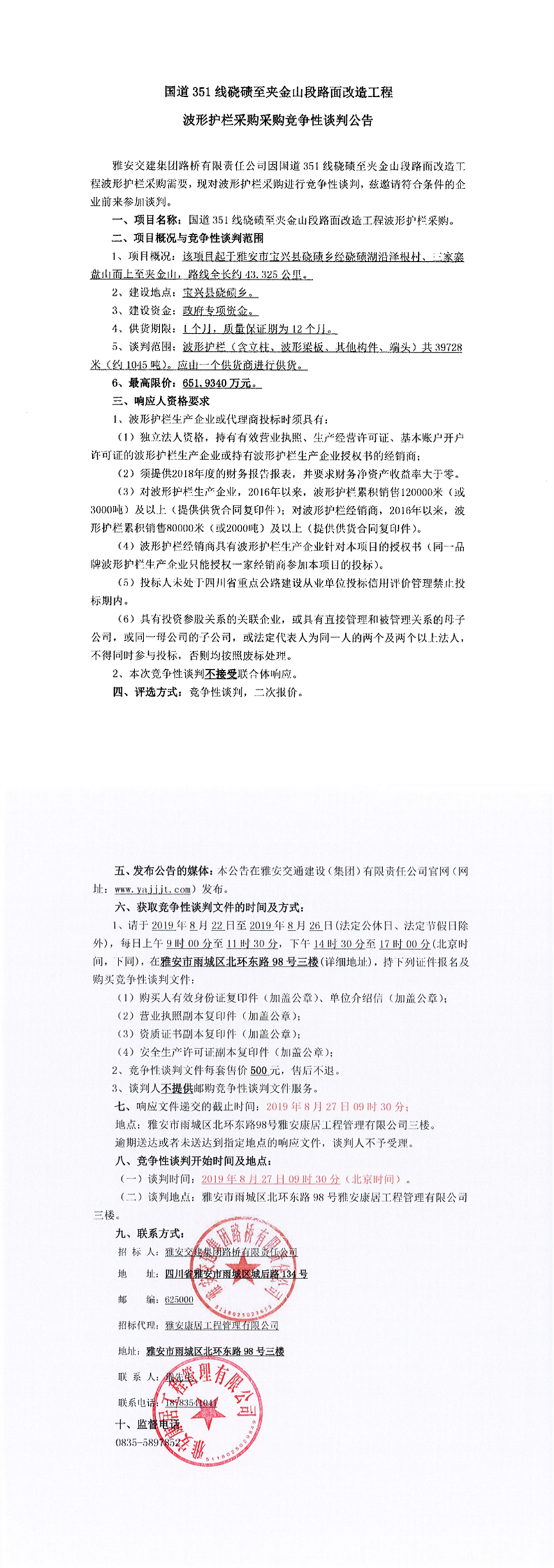 雅安交建集團路橋有限責任公司國道351線磽磧至夾金山段路面改造工程波形護欄采購項目競爭性談判公告