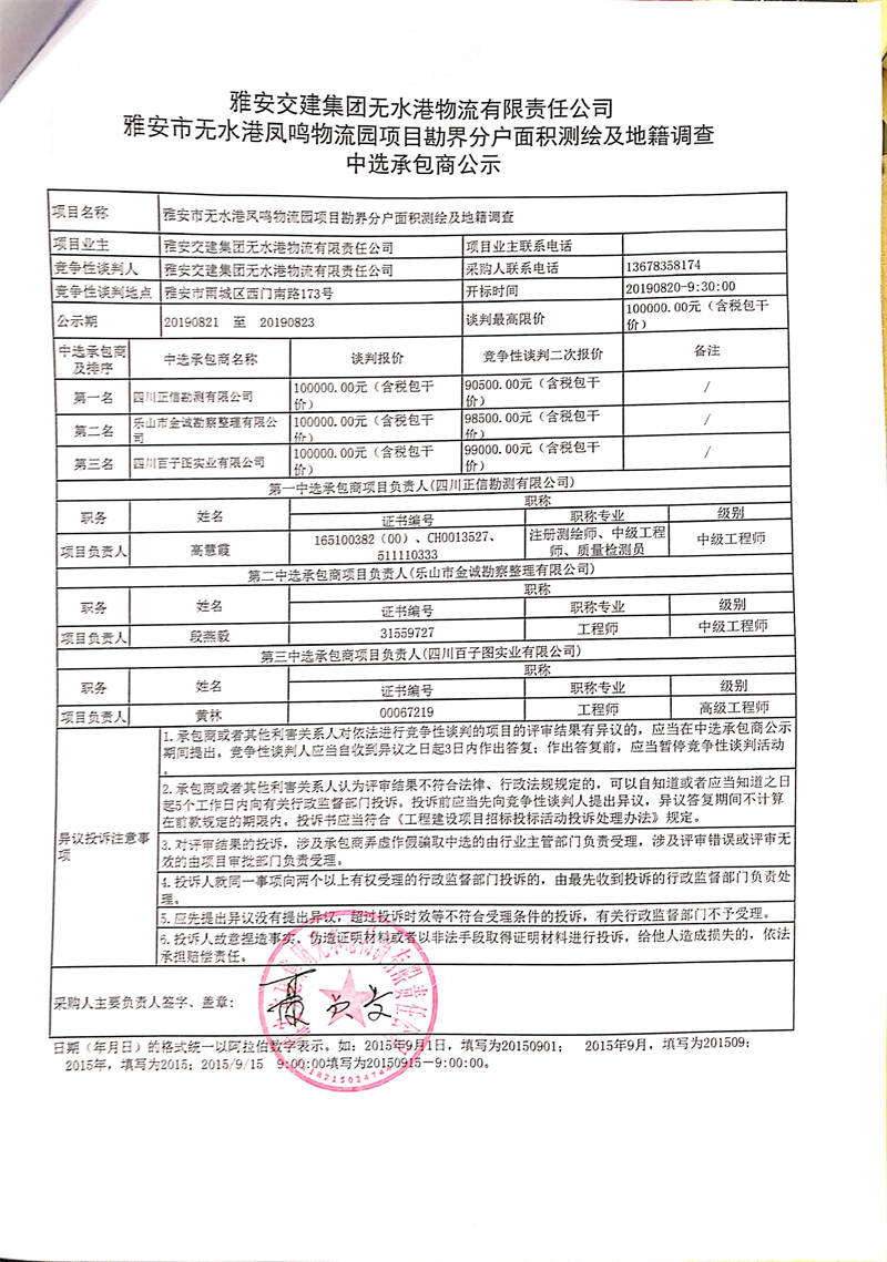 雅安交建集團(tuán)無(wú)水港物流有限責(zé)任公司雅安市無(wú)水港鳳鳴物流園項(xiàng)目勘界分戶(hù)面積測(cè)繪及地籍調(diào)查中選承包商公示