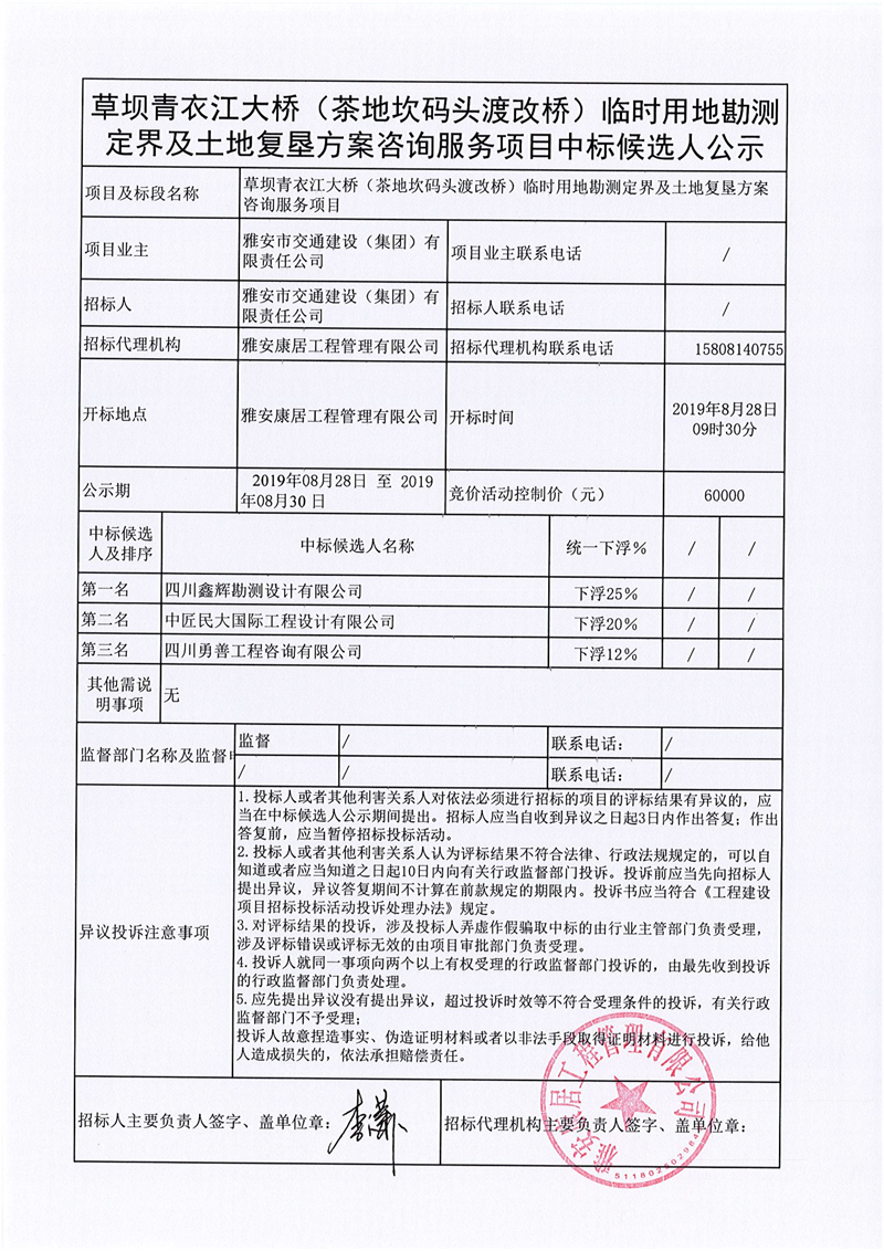 雅安市交通建設(shè)(集團(tuán))有限責(zé)任公司草壩青衣江大橋(茶地坎碼頭渡改橋)臨時(shí)用地勘測(cè)定界及土地復(fù)墾方案咨詢服務(wù)項(xiàng)目競(jìng)價(jià)結(jié)果公示