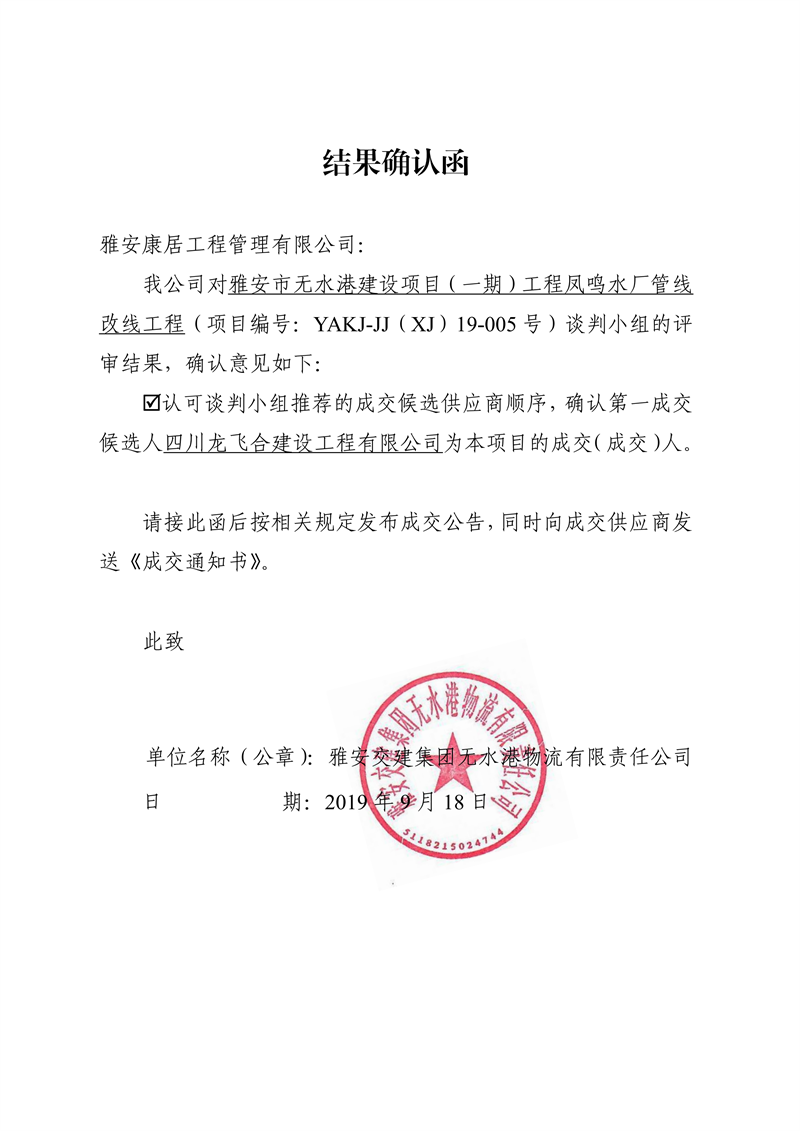 雅安交建集團無水港物流有限責任公司雅安市無水港建設(shè)項目(一期)工程鳳鳴水廠管線改線工程競爭性談判結(jié)果公示