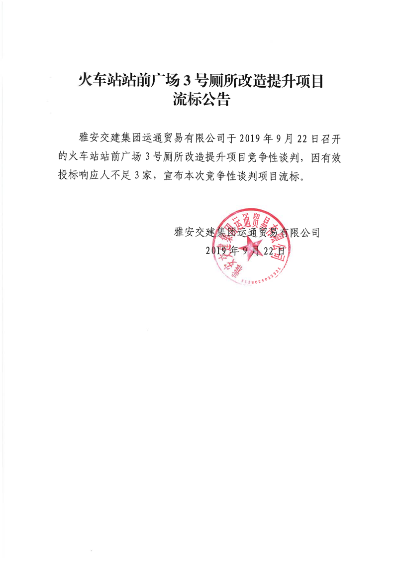雅安交建集團運通貿(mào)易有限公司火車站站前廣場3號廁所改造提升項目流標(biāo)公告