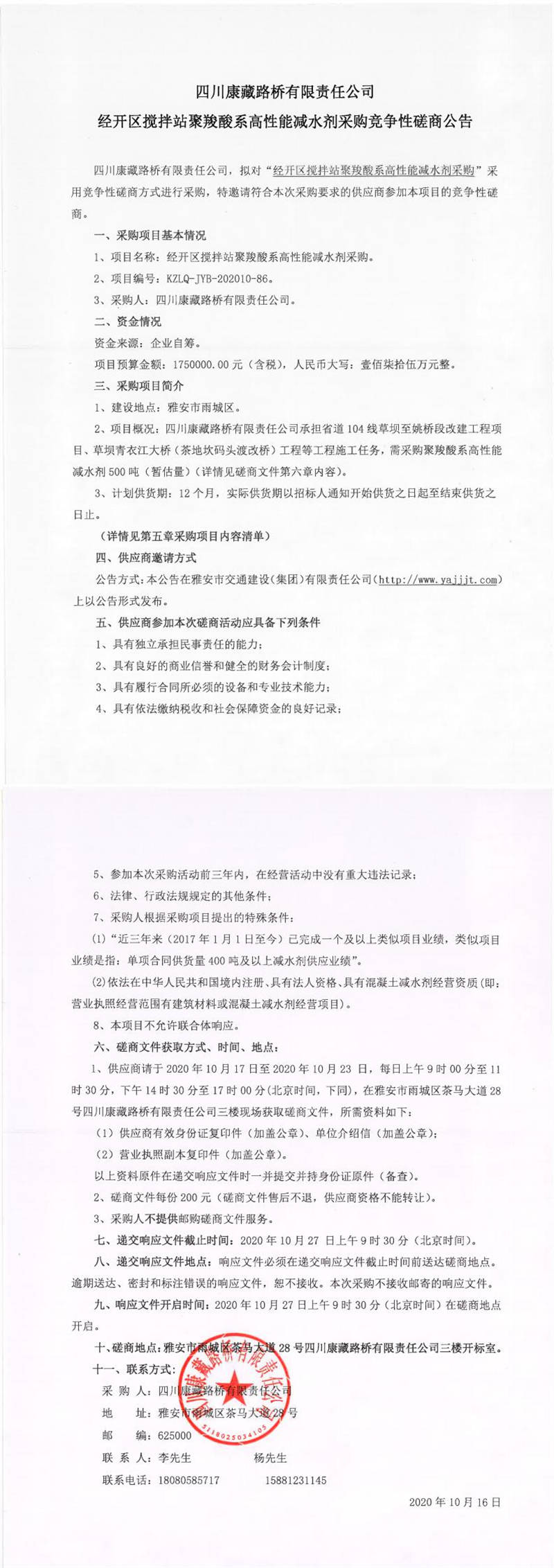 四川康藏路橋有限責(zé)任公司經(jīng)開區(qū)攪拌站聚羧酸系高性能減水劑采購(gòu)競(jìng)爭(zhēng)性磋商公告