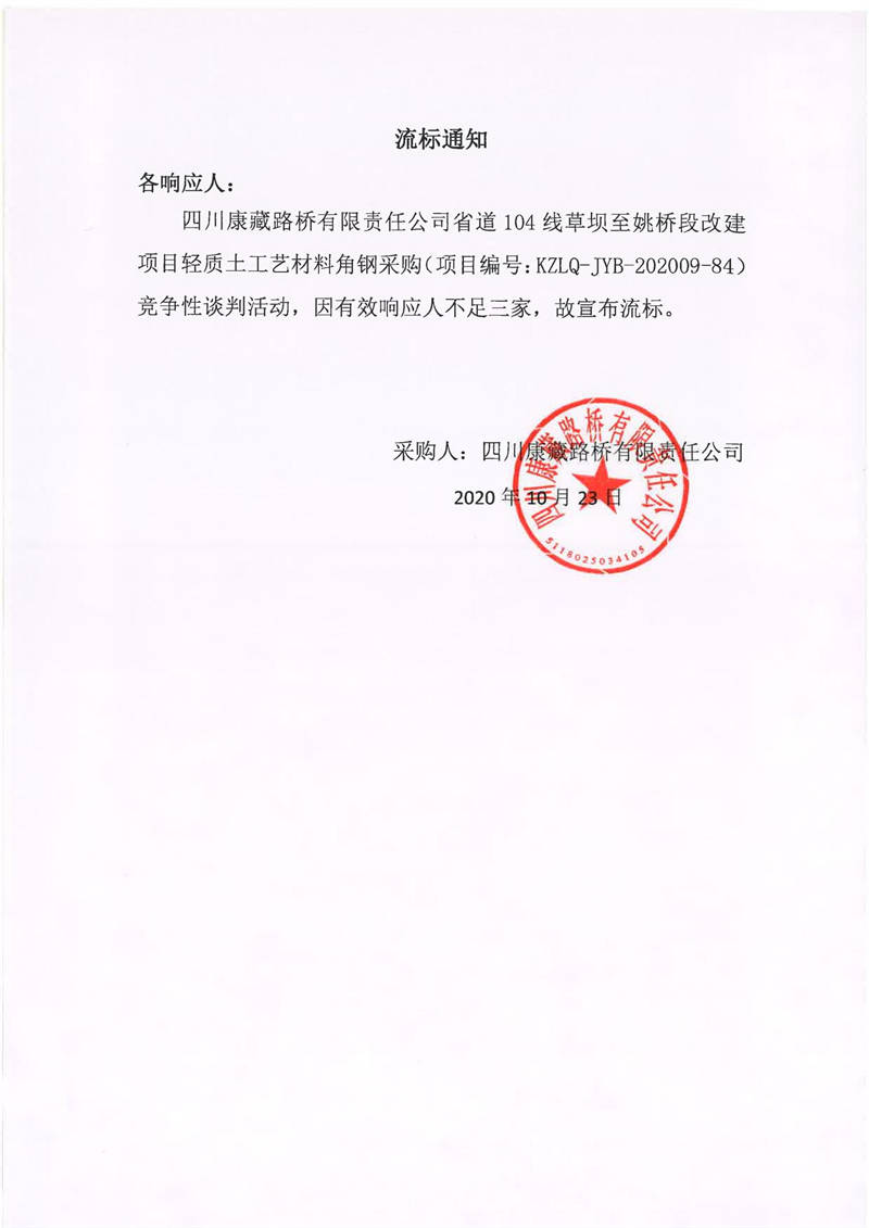 四川康藏路橋有限責任公司省道104線草壩至姚橋段改建項目輕質(zhì)土工藝材角鋼采購項目流標通知