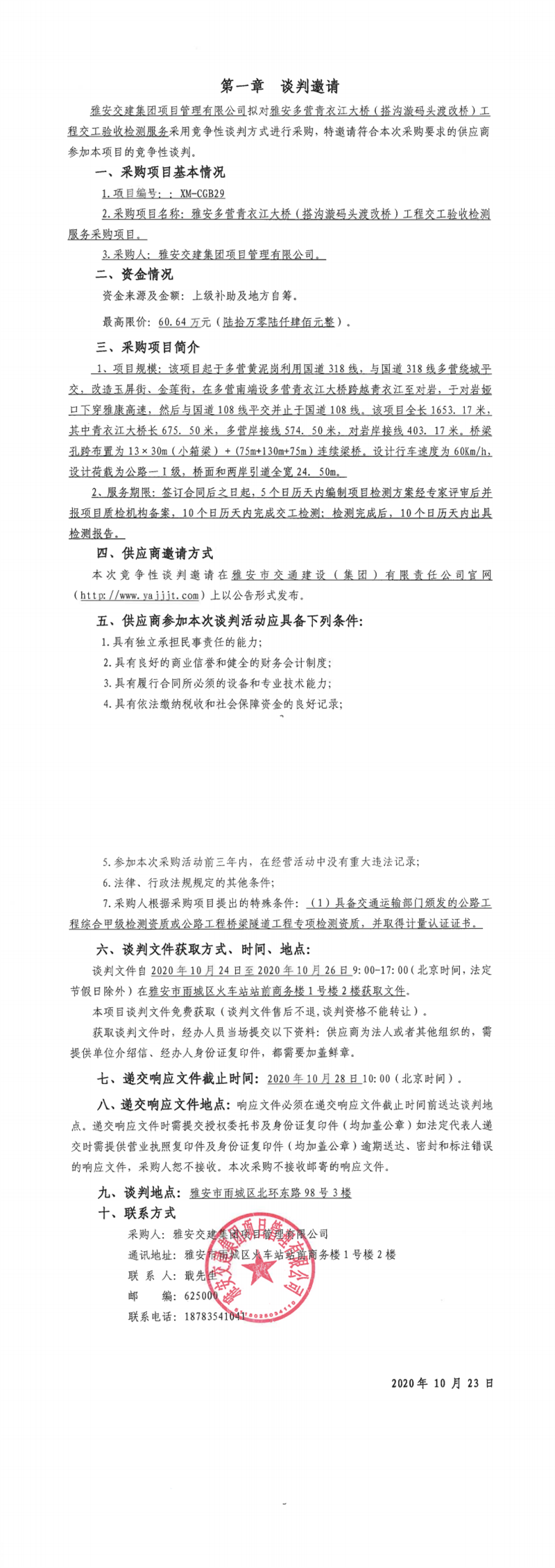 雅安交建集團項目管理有限公司雅安多營青衣江大橋(搭溝漩碼頭渡改橋)工程交工驗收檢測服務(wù)采購項目競爭性談判公告