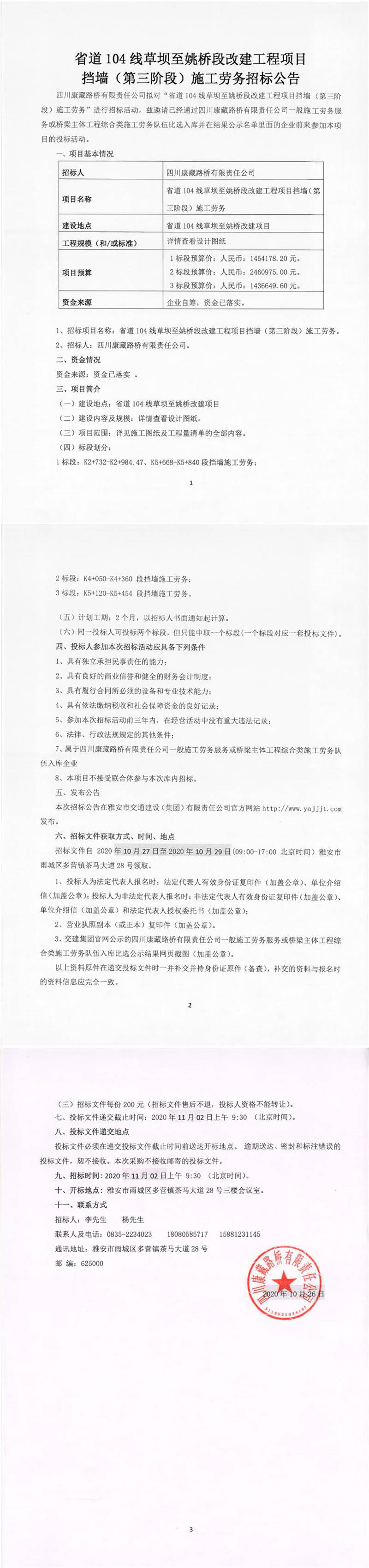 四川康藏路橋有限責(zé)任公司省道104線草壩至姚橋段改建工程項目擋墻(第三階段)施工勞務(wù)招標(biāo)公告