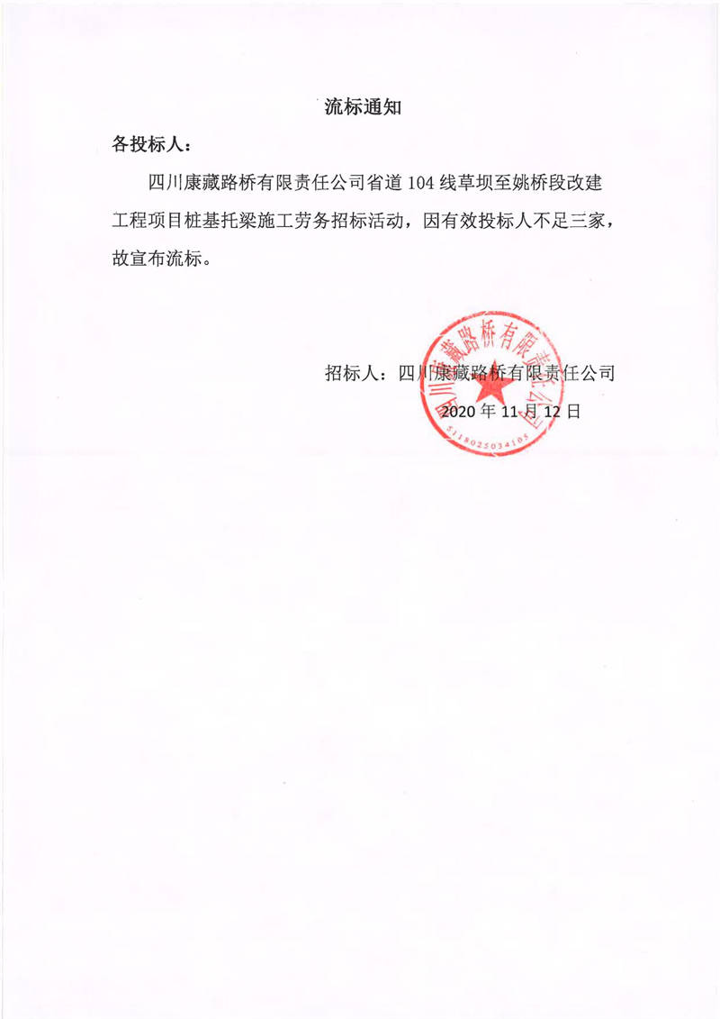 四川康藏路橋有限責(zé)任公司省道104線草壩至姚橋段改建工程項目樁基托梁施工勞務(wù)流標(biāo)通知