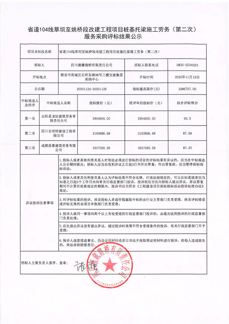 四川康藏路橋有限責(zé)任公司省道104線草壩至姚橋段改建工程項(xiàng)目樁基托梁施工勞務(wù)(第二次)服務(wù)采購(gòu)評(píng)標(biāo)結(jié)果公示