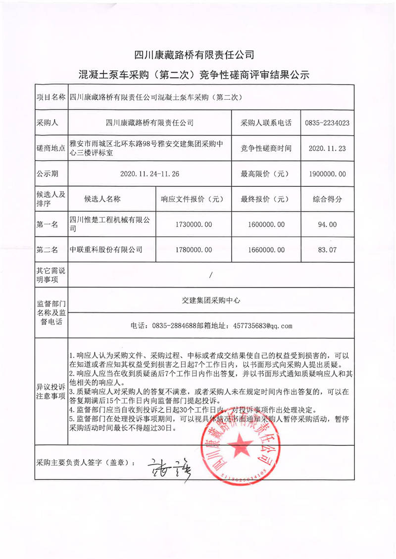 四川康藏路橋有限責(zé)任公司混凝土泵車采購(第二次)競爭性磋商評審結(jié)果公示