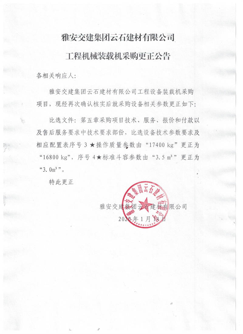雅安交建集團(tuán)云石建材有限公司工程機(jī)械裝載機(jī)采購更正公告