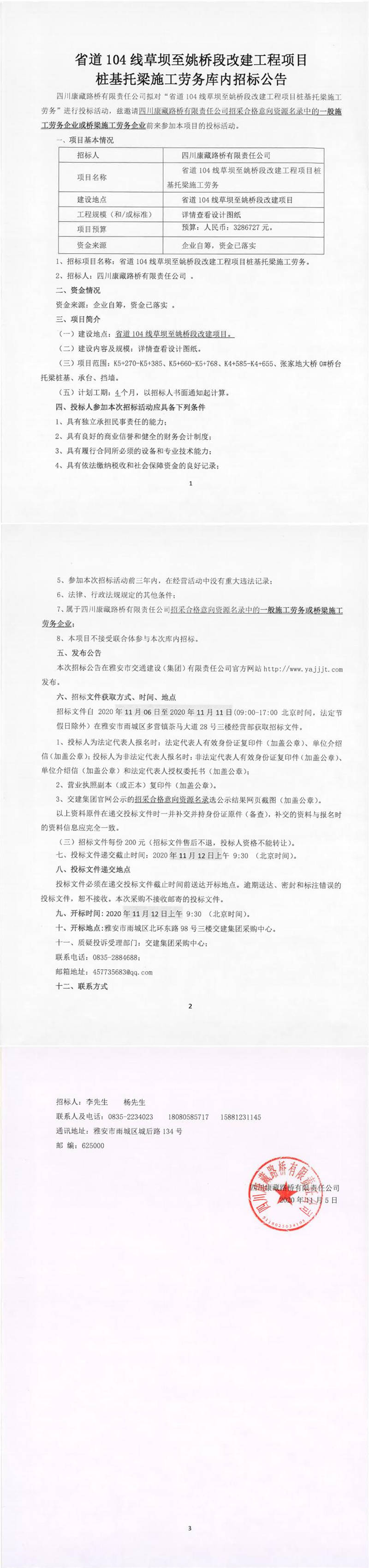四川康藏路橋有限責(zé)任公司省道104線草壩至姚橋段改建工程項(xiàng)目樁基托梁施工勞務(wù)庫(kù)內(nèi)招標(biāo)公告