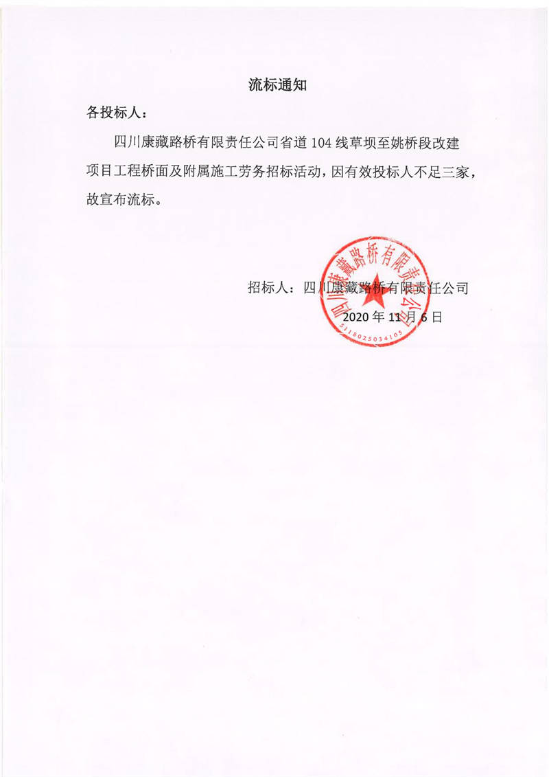 四川康藏路橋有限責(zé)任公司省道104線草壩至姚橋段改建項目工程橋面及附屬施工勞務(wù)流標(biāo)通知