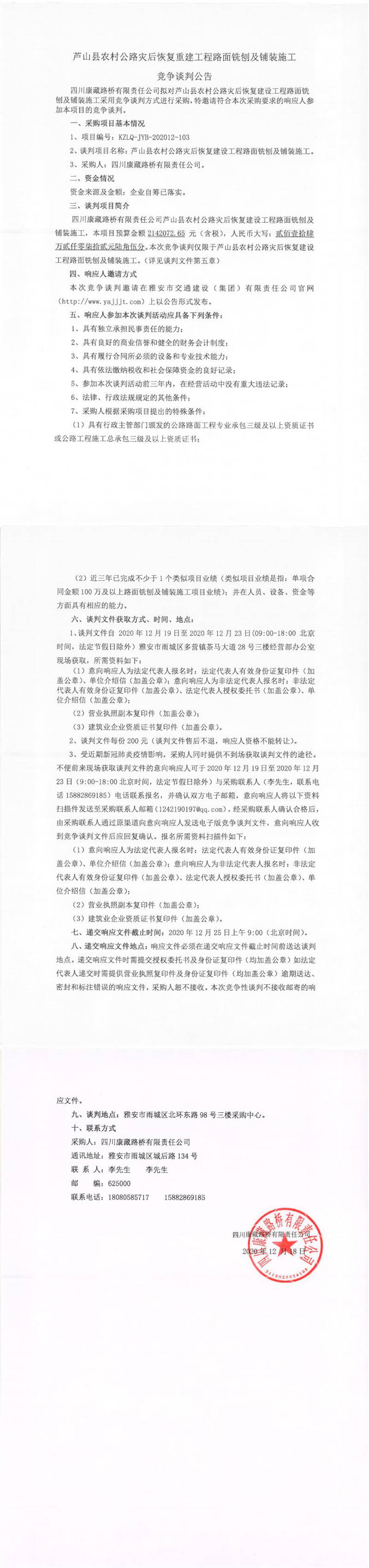 四川康藏路橋有限責(zé)任公司蘆山縣農(nóng)村公路災(zāi)后恢復(fù)建設(shè)工程路面銑刨及鋪裝施工競爭談判公告