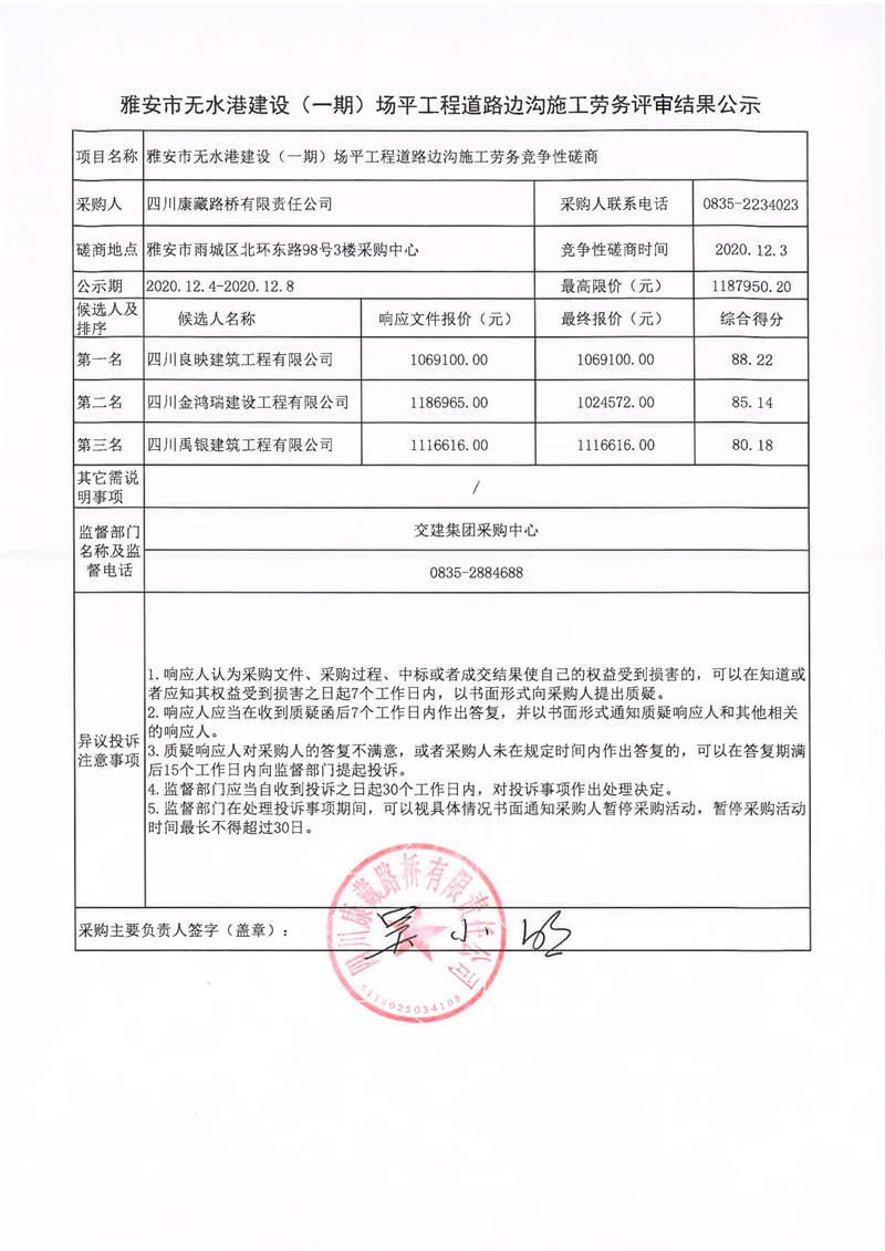 四川康藏路橋有限責任公司雅安市無水港建設(一期)場平工程道路邊溝施工勞務評審結果公示