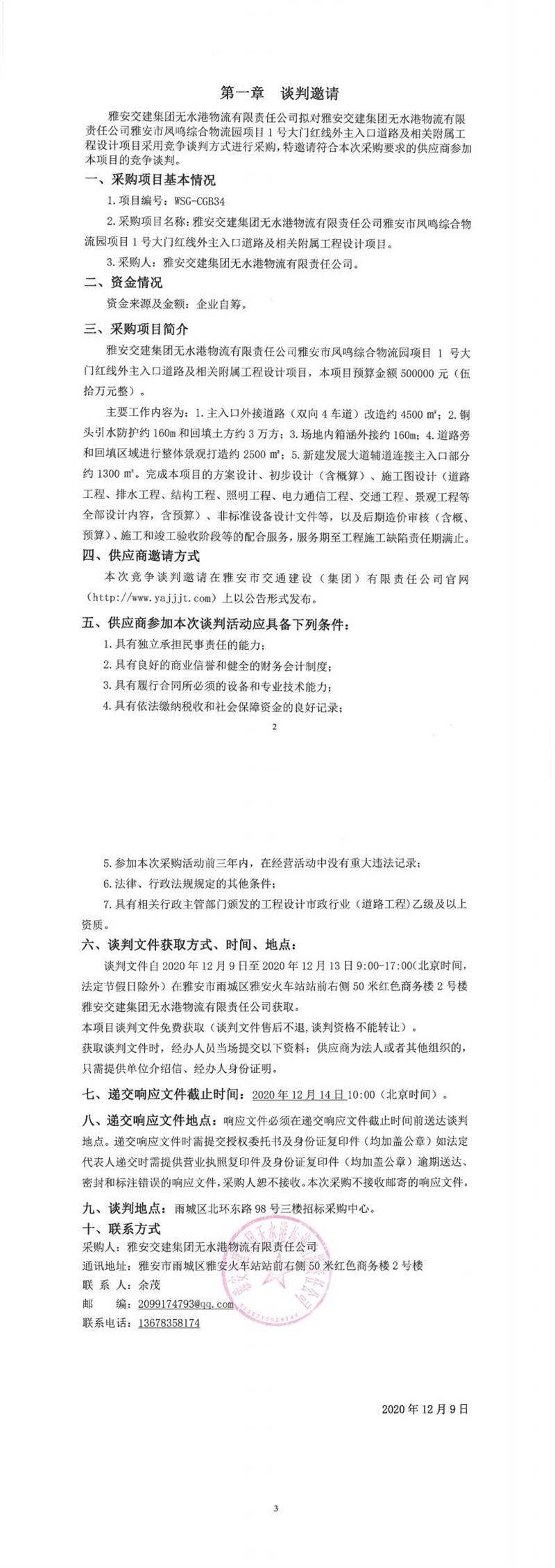 雅安交建集團無水港物流有限責任公司雅安市鳳鳴綜合物流園項目1號大門紅線外主入口道路及相關(guān)附屬工程設計項目競爭談判公告