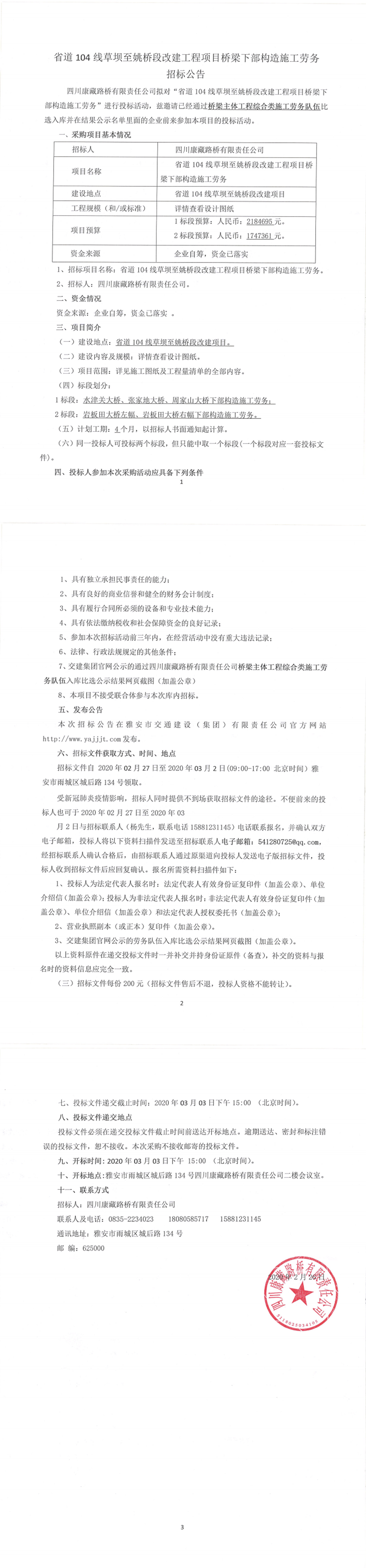 四川康藏路橋有限責任公司省道104線草壩至姚橋段改建工程項目橋梁下部構(gòu)造施工勞務(wù)招標公告