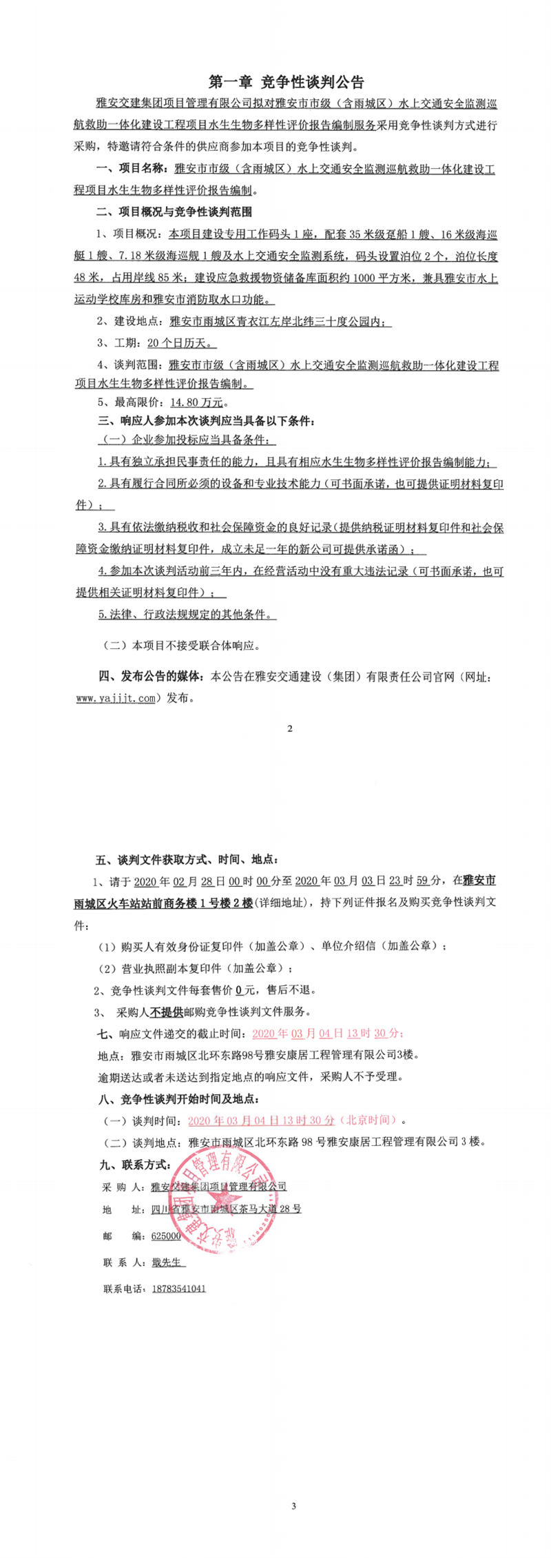 雅安交建集團(tuán)項(xiàng)目管理有限公司雅安市市級(jí)(含雨城區(qū))水上交通安全監(jiān)測(cè)巡航救助一體化建設(shè)工程項(xiàng)目水生生物多樣性評(píng)價(jià)報(bào)告編制競(jìng)爭(zhēng)性談判公告