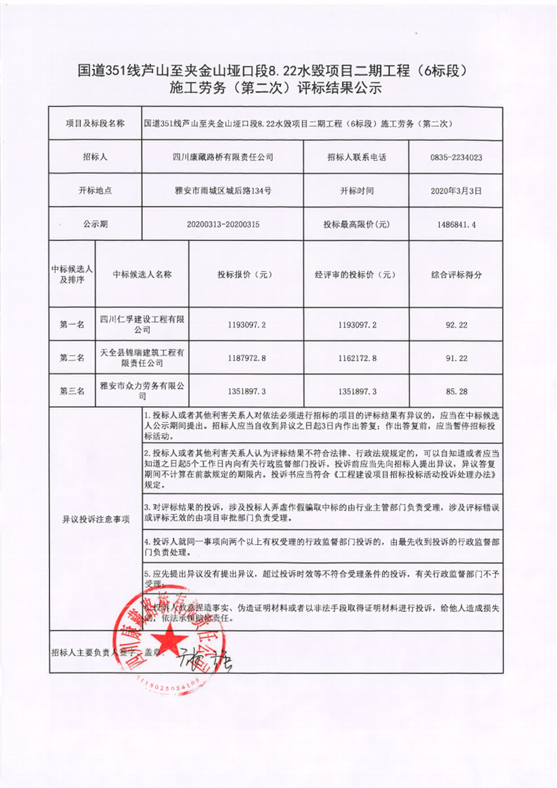 四川康藏路橋有限責任公司國道351線蘆山至夾金山埡口段8.22水毀項目二期工程(1標段)施工勞務(第二次)評標結(jié)果公示