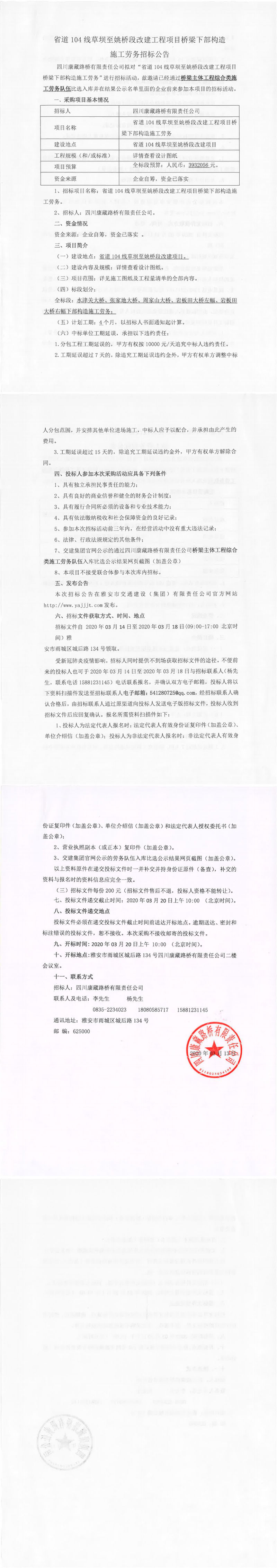 四川康藏路橋有限責(zé)任公司省道104線草壩至姚橋段改建工程項目橋梁下部構(gòu)造施工勞務(wù)招標(biāo)公告