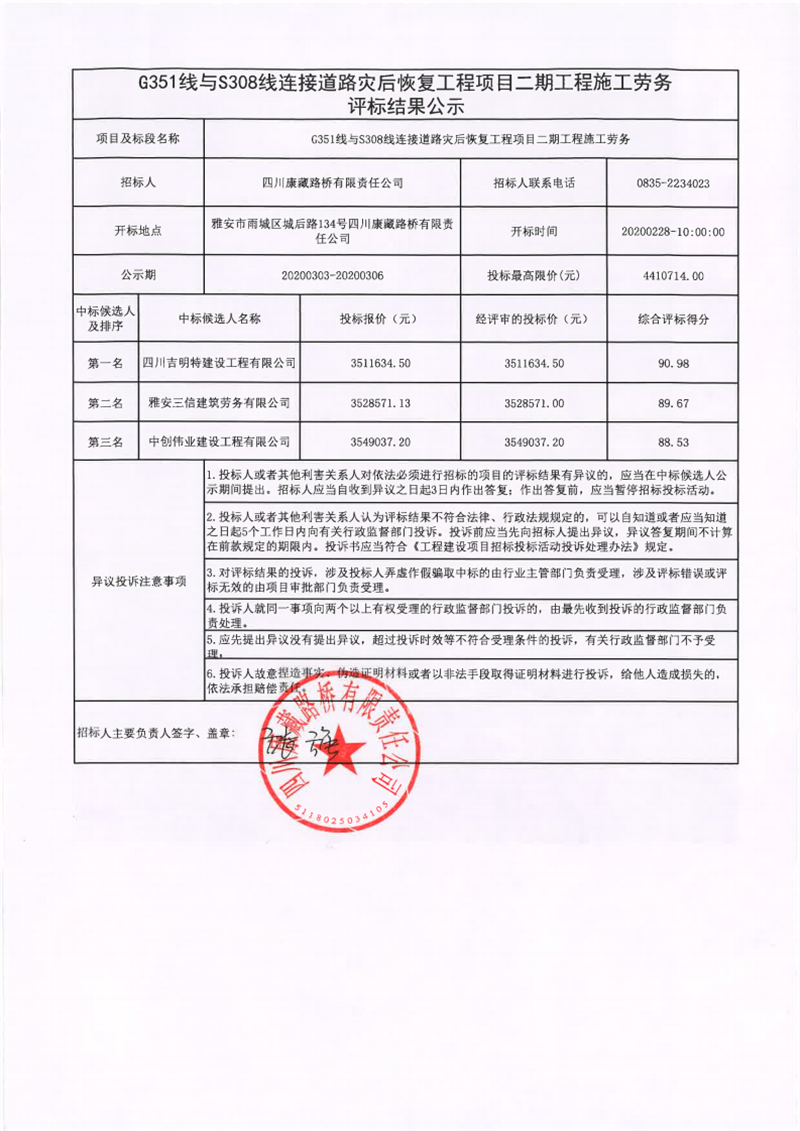 四川康藏路橋有限責(zé)任公司G351線與S308線連接道路災(zāi)后恢復(fù)工程項目二期工程施工勞務(wù)評標結(jié)果公示