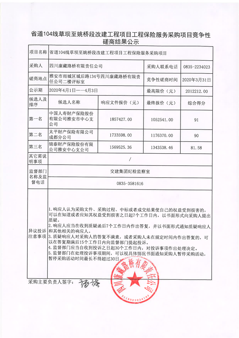 四川康藏路橋有限責(zé)任公司省道104線草壩至姚橋段改建工程項(xiàng)目工程保險(xiǎn)服務(wù)采購項(xiàng)目競爭性磋商結(jié)果公示