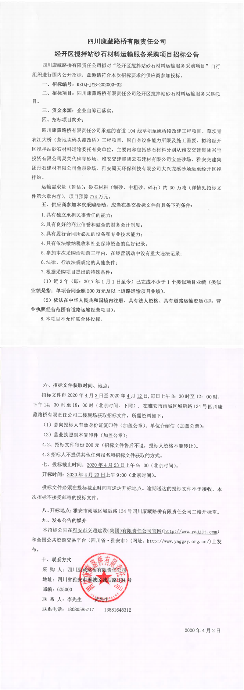 四川康藏路橋有限責(zé)任公司經(jīng)開區(qū)攪拌站砂石材料運輸服務(wù)采購項目招標公告