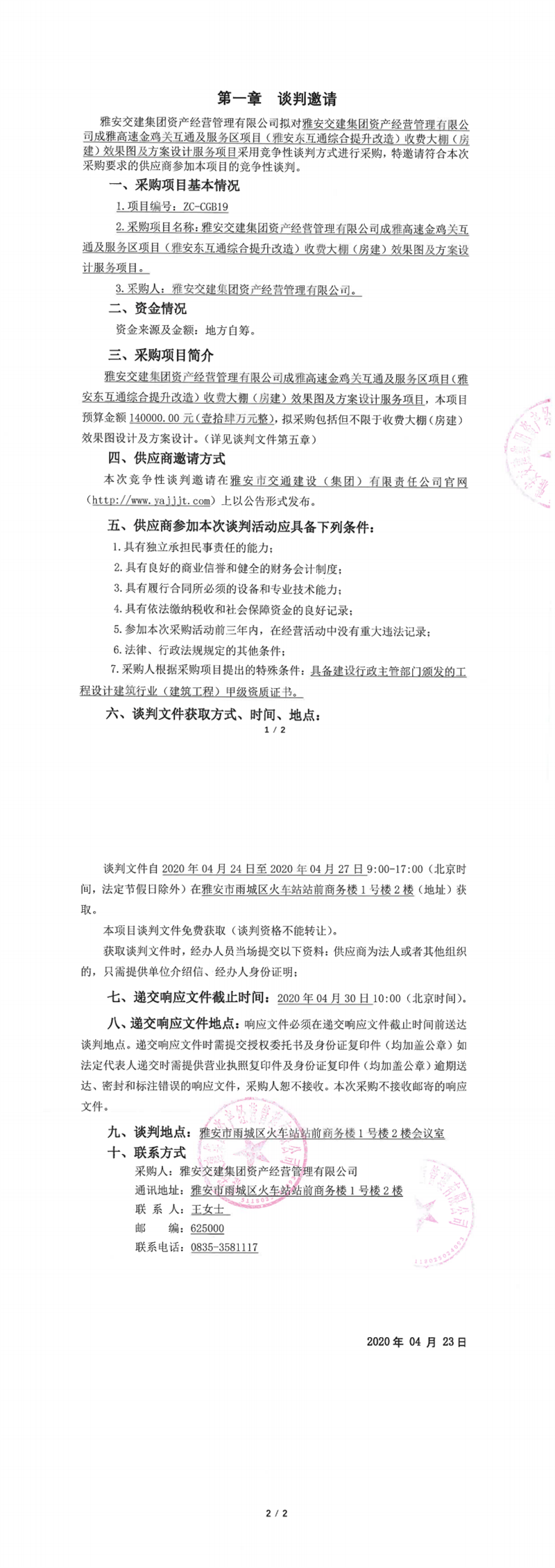 雅安交建集團(tuán)資產(chǎn)經(jīng)營(yíng)管理有限公司成雅高速金雞關(guān)互通及服務(wù)區(qū)項(xiàng)目(雅安東互通綜合提升改造)收費(fèi)大棚(房建)效果圖及方案設(shè)計(jì)服務(wù)項(xiàng)目競(jìng)爭(zhēng)性談判公告