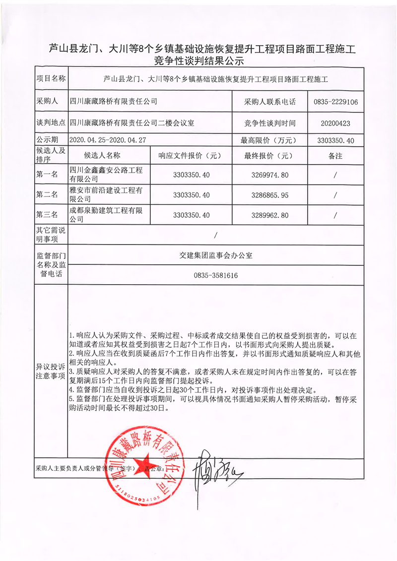 四川康藏路橋有限責(zé)任公司蘆山縣龍門、大川等8個(gè)鄉(xiāng)鎮(zhèn)基礎(chǔ)設(shè)施恢復(fù)提升工程項(xiàng)目路面工程施工競(jìng)爭(zhēng)性談判結(jié)果公示