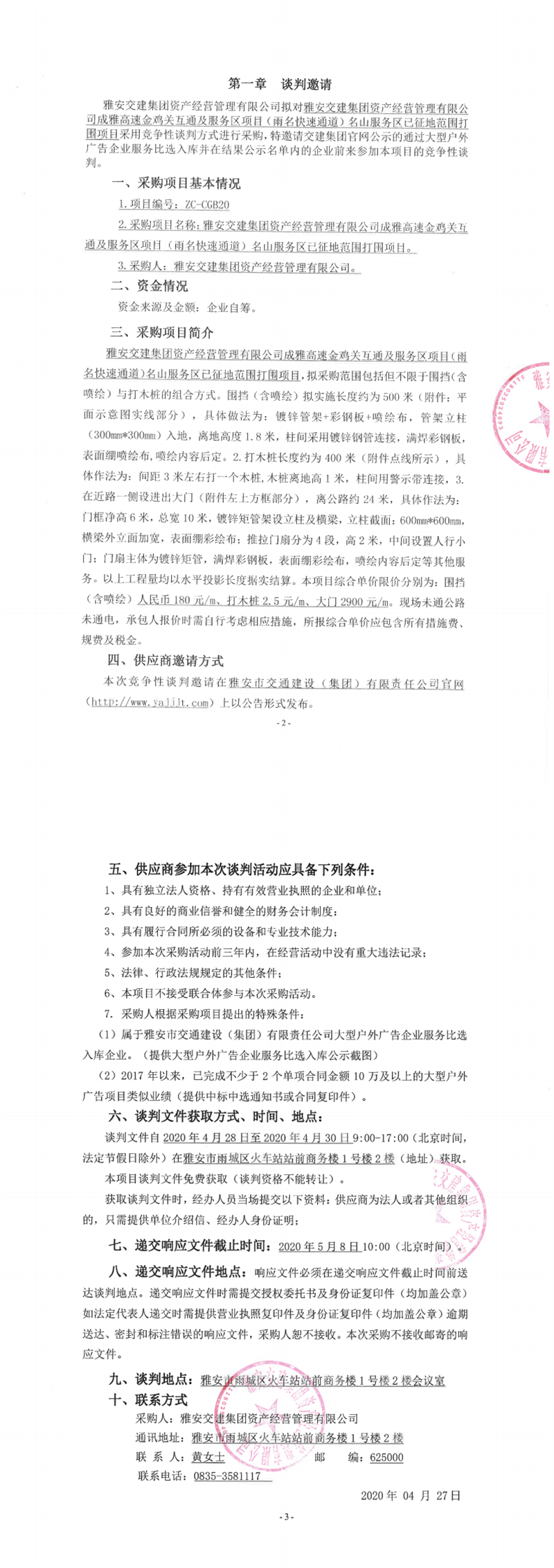 雅安交建集團(tuán)資產(chǎn)經(jīng)營管理有限公司成雅高速金雞關(guān)互通及服務(wù)區(qū)項(xiàng)目(雨名快速通道)名山服務(wù)區(qū)已征地范圍打圍項(xiàng)目競爭性談判公告