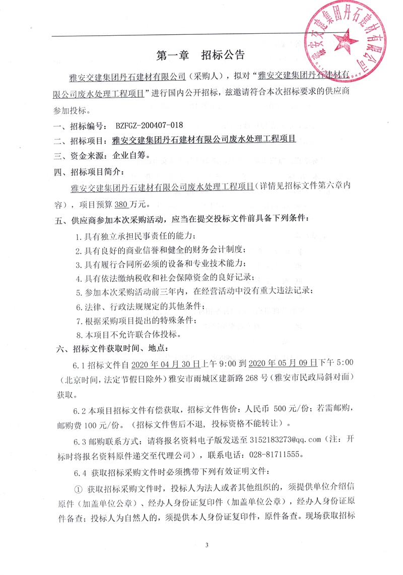雅安交建集團丹石建材有限公司廢水處理工程項目招標(biāo)公告