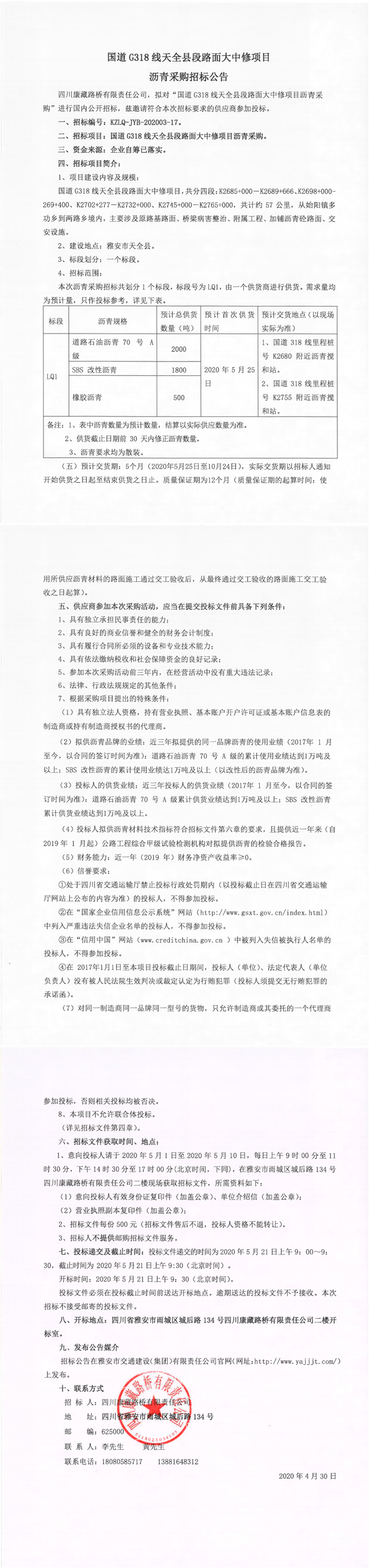 四川康藏路橋有限責(zé)任公司國道G318線天全縣段路面大中修項(xiàng)目瀝青采購招標(biāo)公告