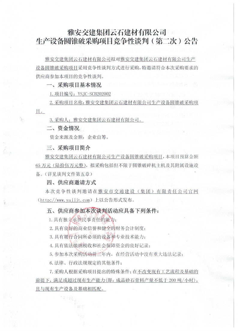 雅安交建集團(tuán)云石建材有限公司生產(chǎn)設(shè)備圓錐破采購(gòu)項(xiàng)目競(jìng)爭(zhēng)性談判(第二次)公告