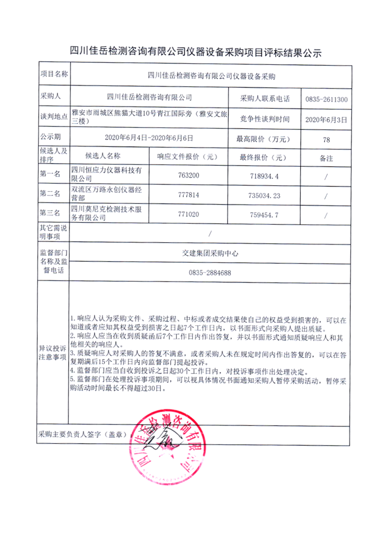 四川佳岳檢測咨詢有限公司儀器設(shè)備采購項(xiàng)目評標(biāo)結(jié)果公示