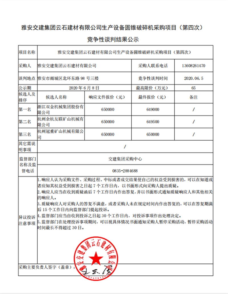 雅安交建集團云石建材有限公司生產(chǎn)設備圓錐破碎機采購項目(第四次)競爭性談判結(jié)果公示