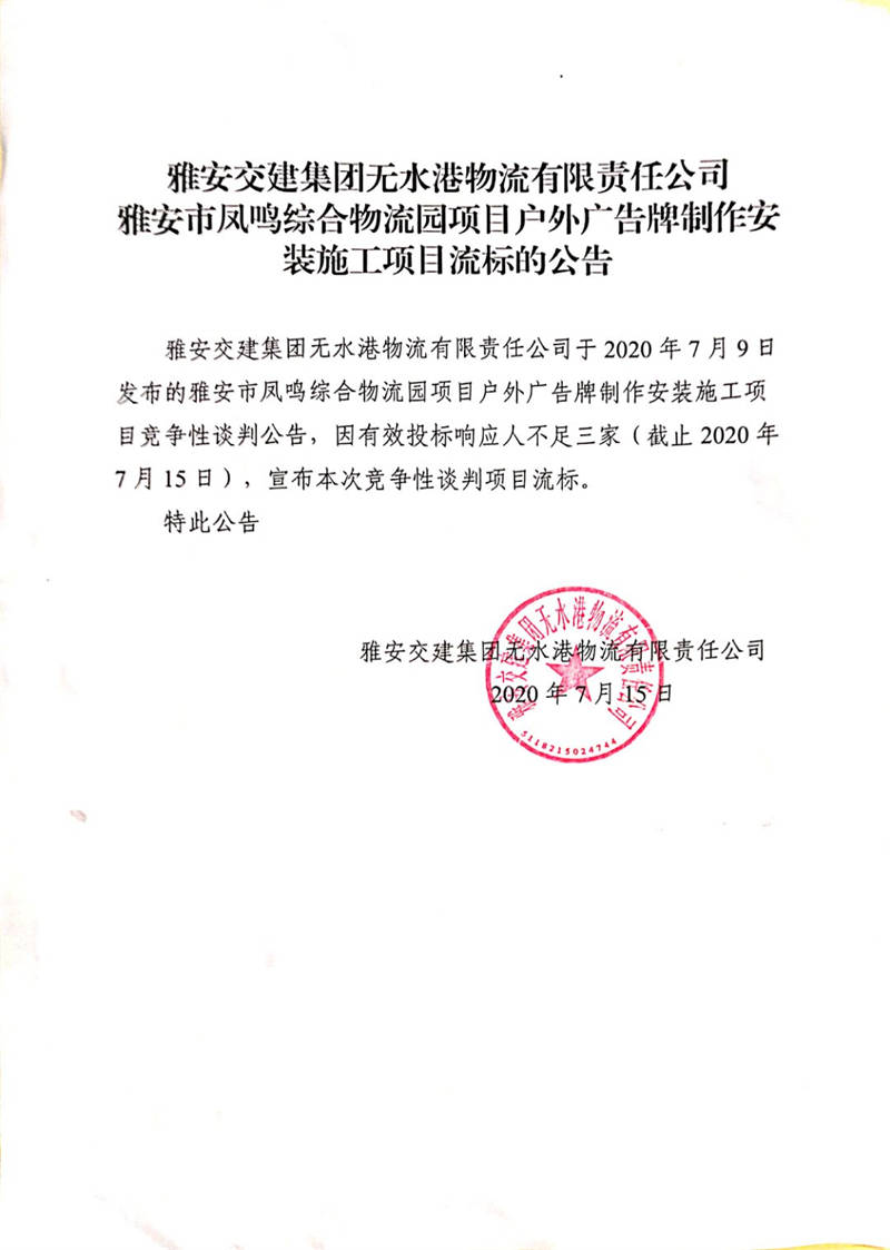 雅安交建集團(tuán)無水港物流有限責(zé)任公司雅安市鳳鳴綜合物流園項(xiàng)目戶外廣告牌制作安裝施工項(xiàng)目流標(biāo)公告